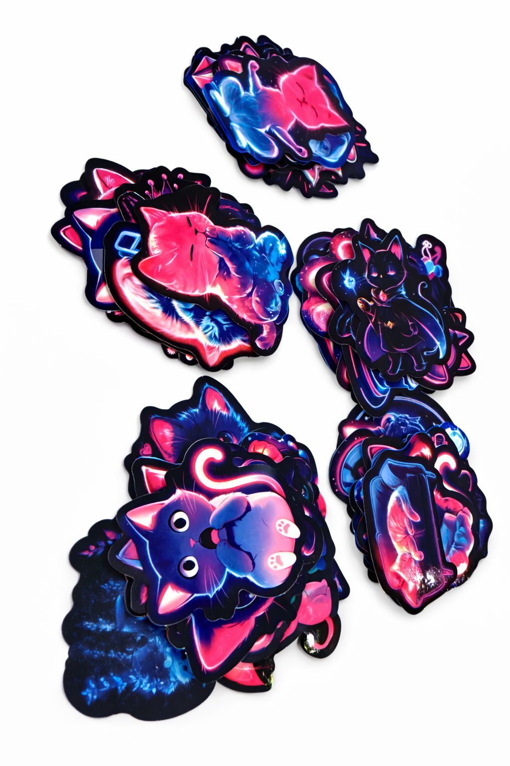 Zestaw 10 naklejek z kotami w stylu neon & fantasy – kolorowe ilustracje kotów w intensywnych, neonowych barwach różu, fioletu i niebieskiego. Wyrazisty, nowoczesny styl z magicznym klimatem. Idealne do journalingu, scrapbookingu, planerów, laptopów i dekoracji. Świetny wybór dla miłośników kotów i estetyki fantasy 🐱✨